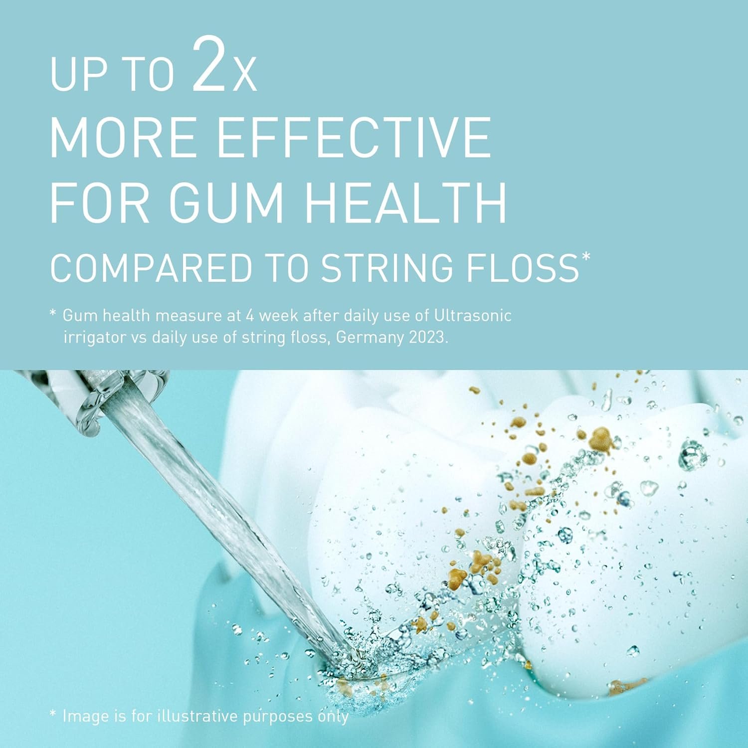 Healthier gums: healthier gums in just 1 week compared to a manual toothbrush, with up to 2x increased effectiveness for gum health compared to conventional dental floss (SGS proderm, 2023)