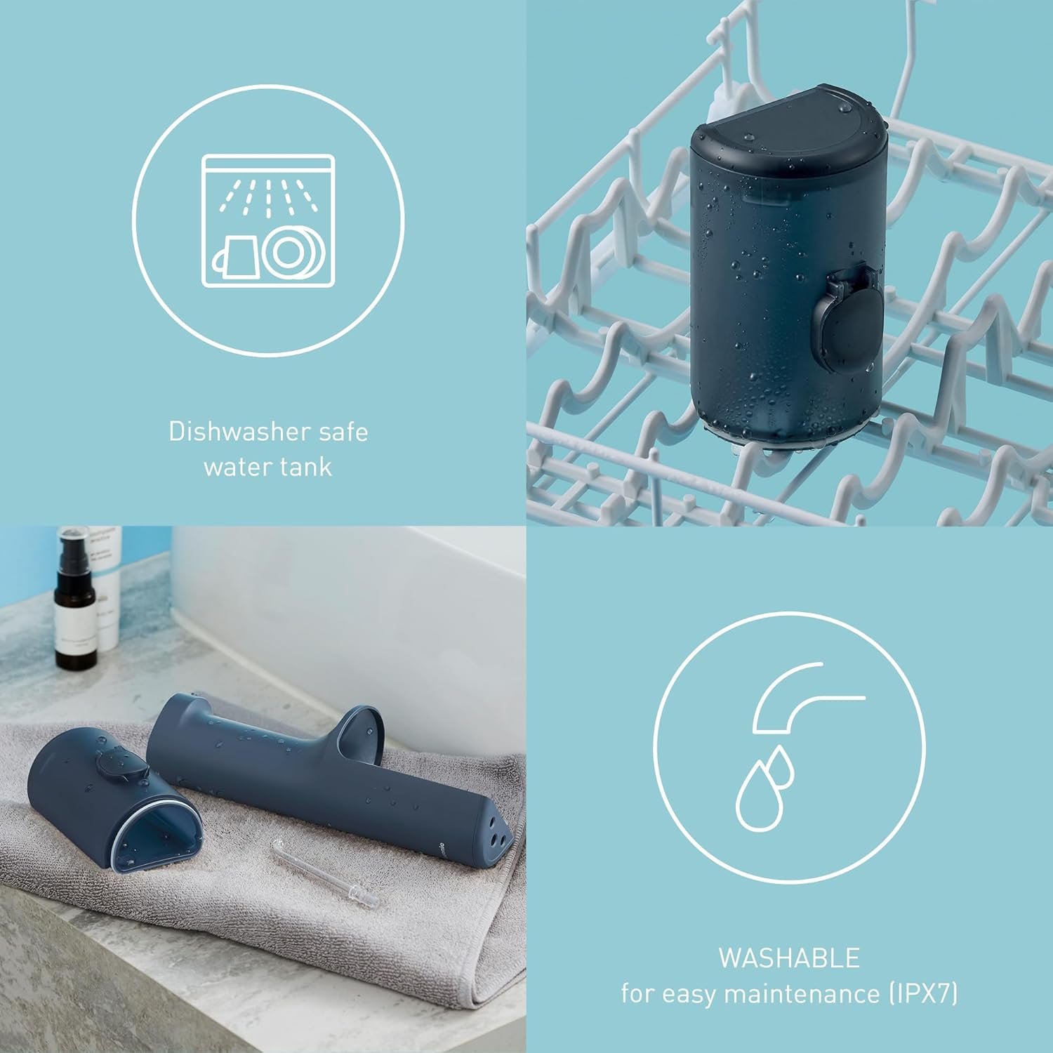 EASY TO USE The IPX7 waterproof device and dishwasher safe tank ensure easy cleaning, while a wireless charging and 200ml water tank for 60 seconds of use make this oral irrigator user-friendly and ideal for on the go